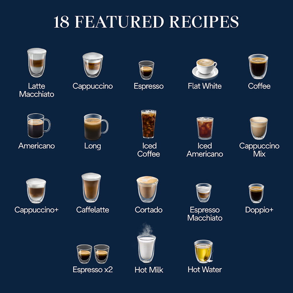 18 recetas programables, desde espresso hasta cappuccino, latte y más